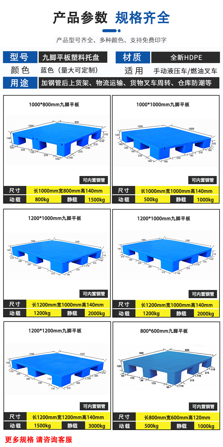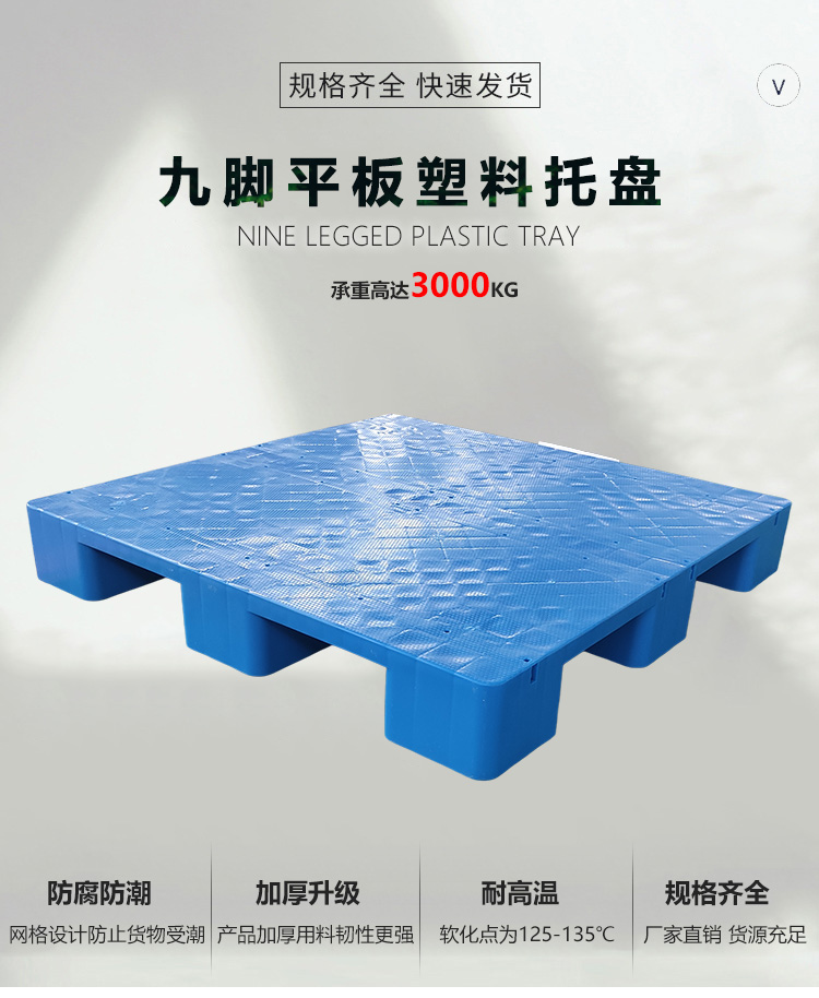 九脚平板托盘塑胶托盘防潮垫板工厂仓储周转塑料托盘,承载力强,动载1500kg,静载2000kg.